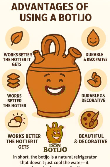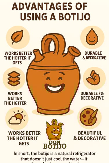 Beyond its traditional charm, the botijo is a modern solution to an age-old problem: how to keep water cool without using energy. Here are some of its main advantages: