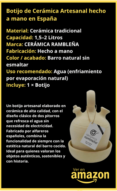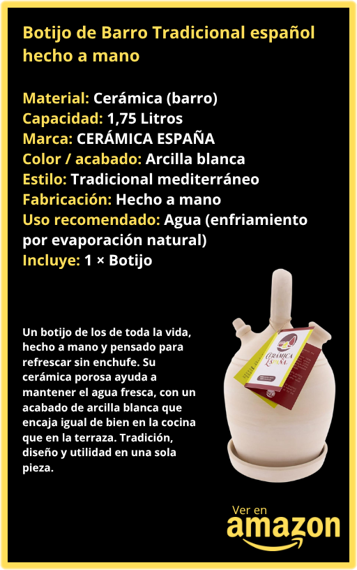 Da igual si lo usas para mantener el agua fresca en verano o como pieza de conversación en tu terraza: un buen botijo no necesita enchufe, solo buen gusto y ganas de volver a lo natural.