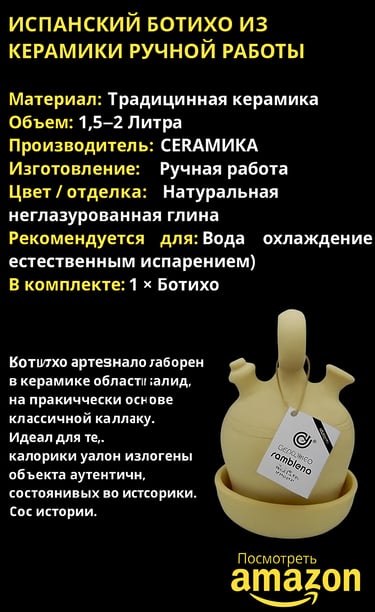 Хотя его происхождение теряется во времени, ботихо на протяжении веков сопровождал народы Средиземноморья. Он появился как простой и гениальный способ сохранять воду прохладной и вскоре стал символом народной изобретательности. Из глины и воздуха, без проводов и тайн — ботихо пережил моды, холодильники и поколения, доказывая, что подлинное никогда не выходит из моды.